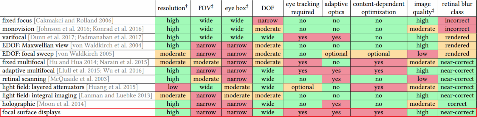 Дисплеи с фокальной поверхностью следуют пути, заданному варифокальными и мультифокальными концепциями, и настраивают виртуальные изображения под содержимое сцены. Было обнаружено, что, благодаря десятилетиям разработок в тесно связанной области адаптивной визуализации, для этого хорошо подходят модули фазовой модуляции SLM. Учёные Oculus надеются вдохновить коллег по всему миру на использование своей разработки как промежуточного решения на пути к избавлению от так называемого конфликта сигналов вергентности и приспособляемости (проблема фокусировки, вызванная асинхронным движением глаз). В будущем варифокальные дисплеи также могут избавить людей с нарушениями зрения от необходимости использовать очки со шлемами ВР. Однако, по собственному признанию, разработчиков, технология далека от потребительского применения.