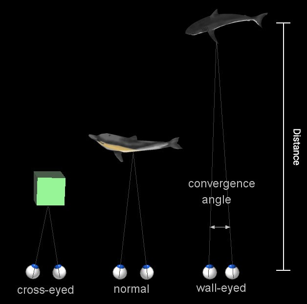 Вергентностью называют функцию сведения зрачков к переносице, чтобы перекрестье линий вида каждого глаза попадало на искомый объект. Для удалённых объектов линии вида почти параллельны, поскольку расстояние между ними очень мало по сравнению с расстоянием до объекта, то есть каждый глаз видит почти одно и то же. Для фокусировки на близких объектах зрачки сводятся. В качестве эксперимента сфокусируйтесь двумя глазами на пальце перед глазами, а затем на объекте за ним: сначала вы увидите удвоение объектов за пальцем, а затем удвоение пальца.