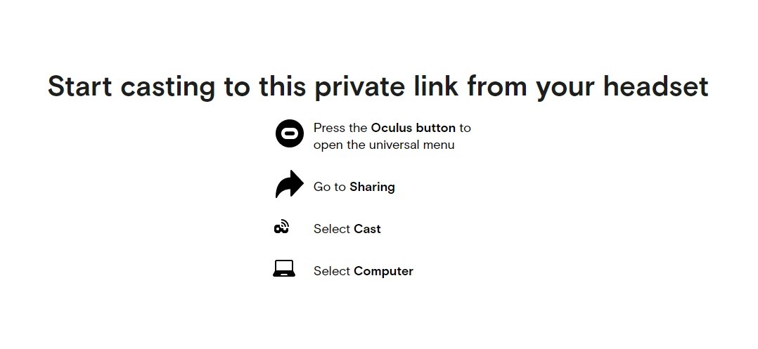 Трансляция в браузер работает для авторизованных пользователей на странице https://www.oculus.com/casting. Для этого нужно перейти на страницу через браузер Chrome или Microsoft Edge и войти в учётную запись Facebook.