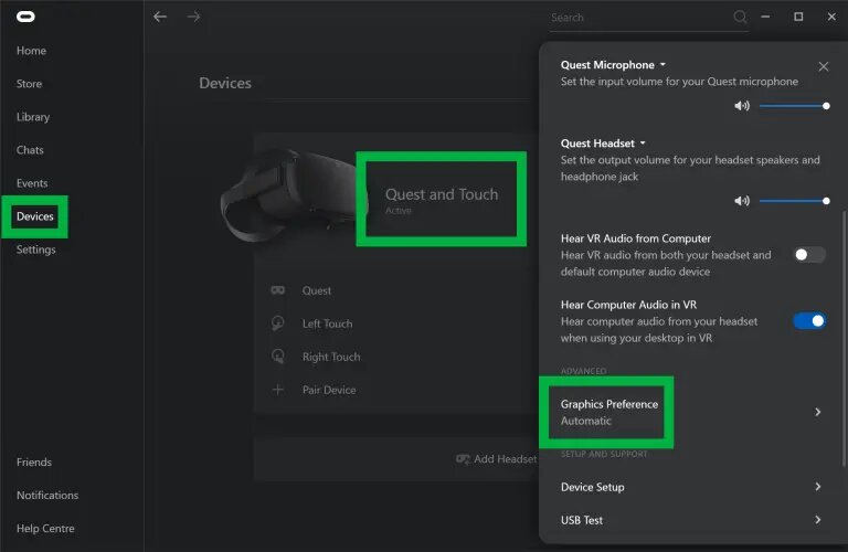 Если вы загрузили бету Oculus PC Software v19, вы найдёте опции графики на вкладке «Устройства» приложения Oculus для ПК. Нажмите «Quest и Touch» и прокрутите вниз до графических настроек: