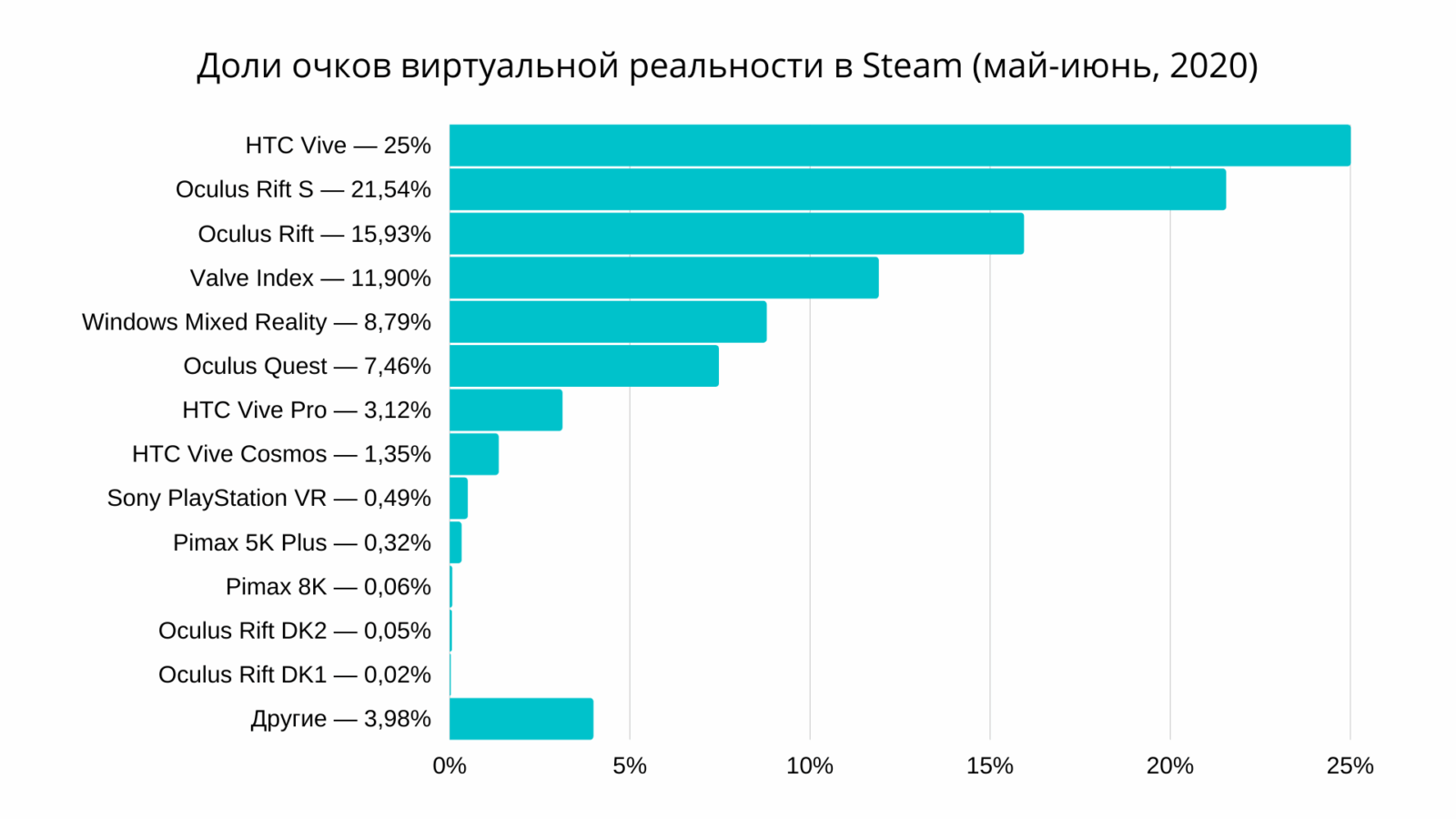 Статистические данные магазина Steam, самого крупного магазина приложение виртуальной реальности для ПК с покрытием подавляющей части платформ и пользователей, говорят, что количество подключённых к Steam хотя бы раз за месяц очков по отношению к общему числу пользователей магазина выросло незначительно. Рост больше похож на погрешность: если в апреле очки были у 1,91% пользователей, то в мае — у 1,92%. Зато разработчики Oculus Quest празднуют победу.