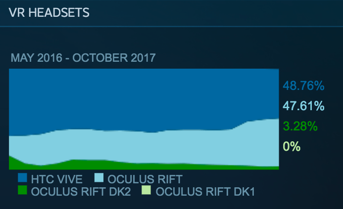 Согласно свежему октябрьскому отчёту Steam о популярности программного и аппаратного обеспечения виртуальной реальности у пользователей магазина, Oculus Rift продолжает укреплять позиции. Популярность продукта Facebook выросла на 0,71% и составляет 47,61% от всех очков, в которых пользователи играют в проекты, купленные в Steam. Под Vive, главное устройство платформы SteamVR, шатается трон: доля очков HTC составляет 48,76%, то есть опережает долю Rift менее чем на процент.