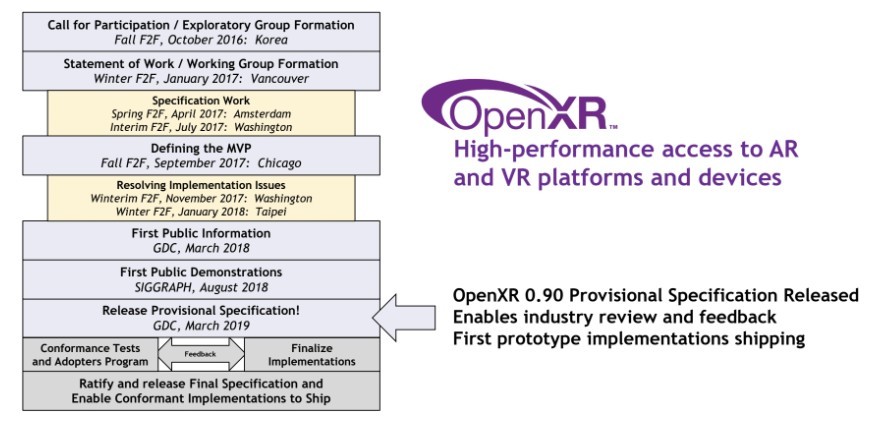 Стандарт OpenXR открыт и не требует лицензионных отчислений. Предварительная версия 0.90, опубликованная на сайте Khronos, предназначена для того, чтобы разработчики могли знакомиться с проектом и оставлять отзывы для его улучшения. Получая доступ к общему набору объектов и функций, соответствующих жизненному циклу, рендерингу, отслеживанию, синхронизации кадров и вводу, с помощью OpenXR разработчики могут запускать приложения на различном оборудовании с минимальными усилиями по адаптации.
