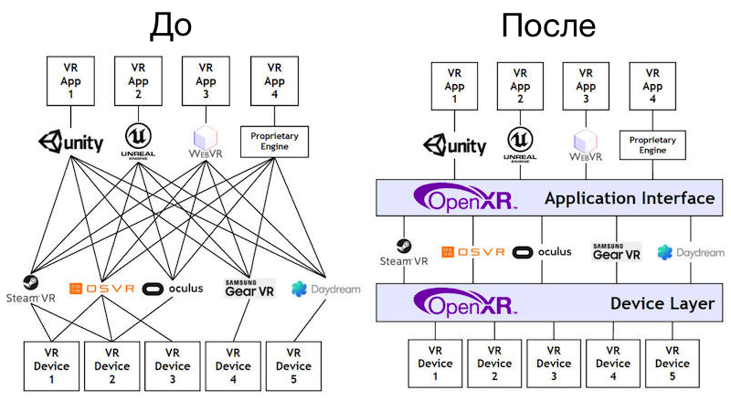 Как вы могли заметить, все они являются значимыми игроками рынка дополненной и виртуальной реальности, потратившими массу ресурсов на его становление. Следующим шагом стала разработка единого стандарта OpenXR для кроссплатформенного взаимодействия соответствующих приложений и устройств. Он снизит фрагментацию отрасли и упростит взаимодействие между решениями и разработчиками.