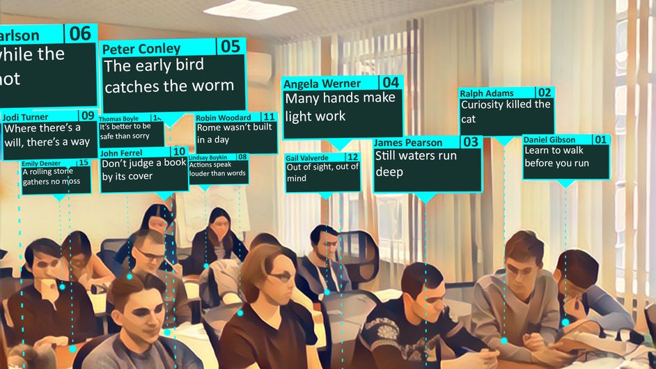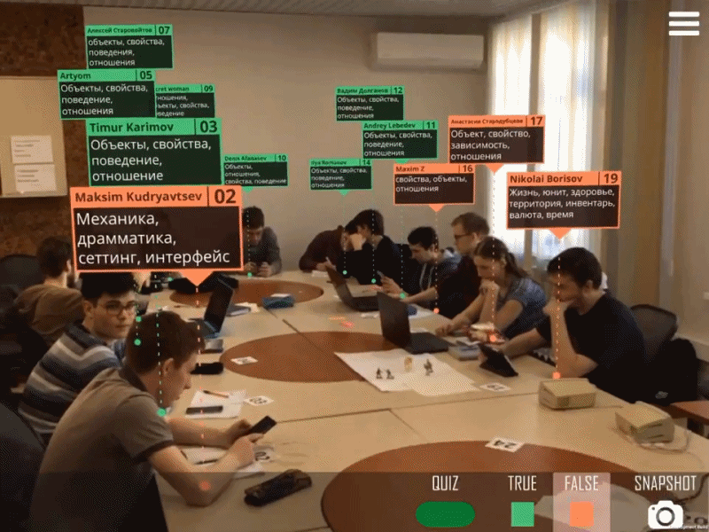 Учитель присваивает номер каждому ученику, размещая на столах листы бумаги с напечатанными на них цифрами. Затем учитель переходит в режим конфигурирования комнаты в приложении «Our Minds AR» и отмечает место каждого ученика с помощью камеры. Теперь группа может начать работать в дополненной реальности. Весь текст, набранный в мессенджерах, появится в выносках.