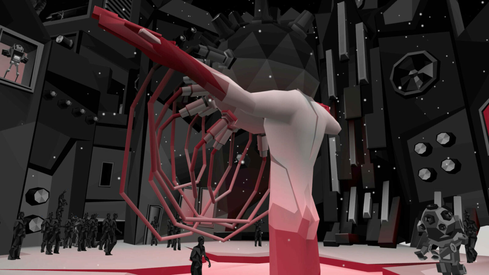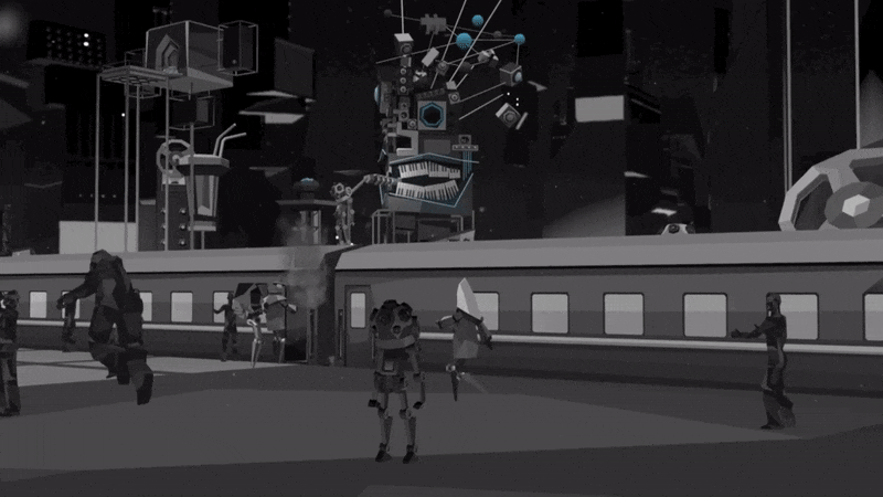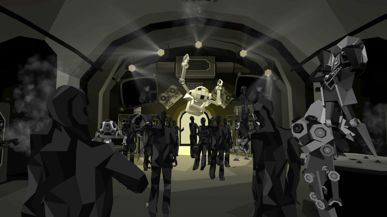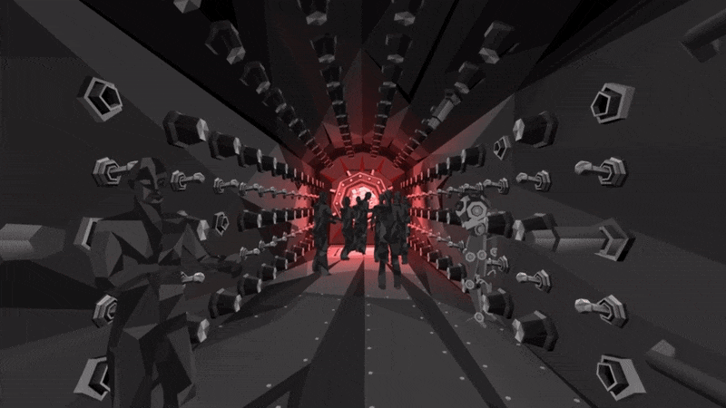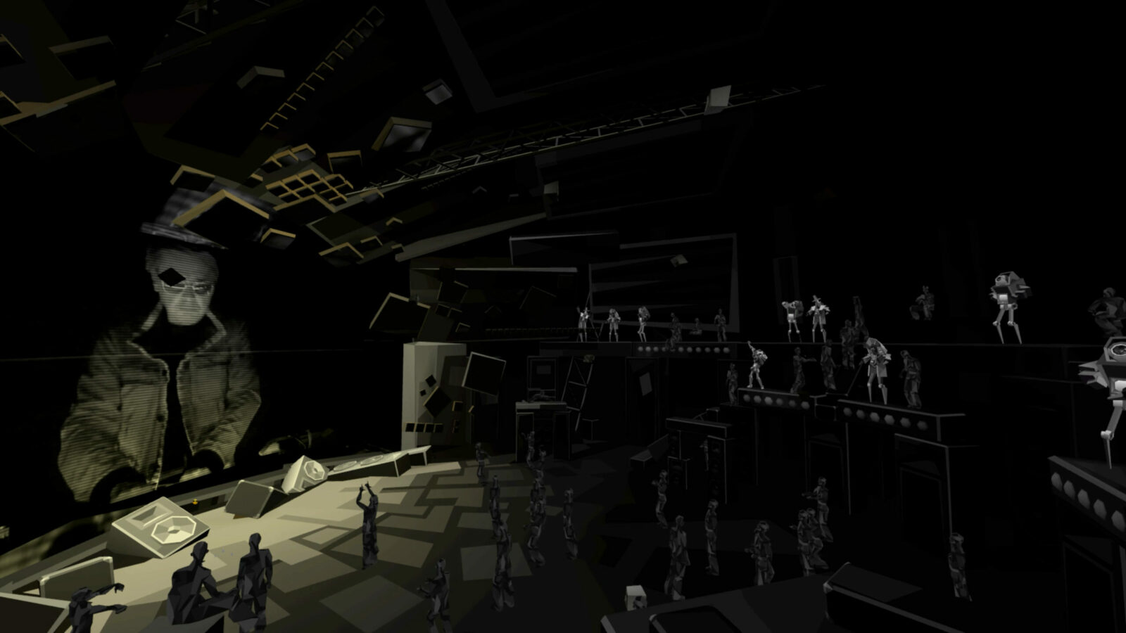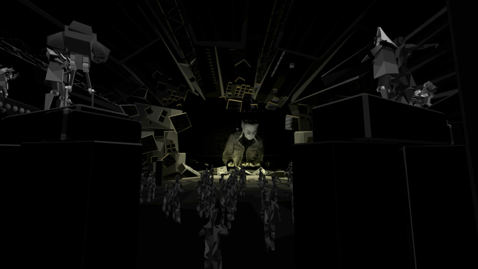 Посетителей встречал холл, провоцирующий тесное скопление аватаров в ожидании начала. Атмосферу поддерживал дресс-код: гостей просили сменить красочные аватары VRChat на стандартные для всех минималистичные образы, которые будто превращали людей в жителей города — действующих лиц перфоманса. Выход из холла в город удивлял неожиданными масштабами происходящего.