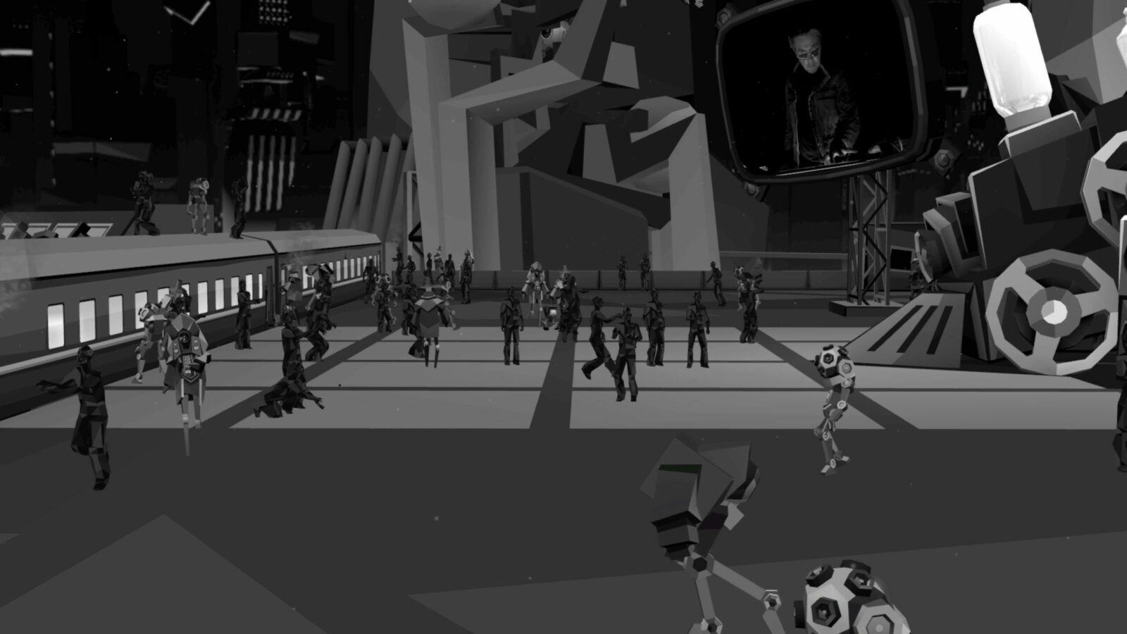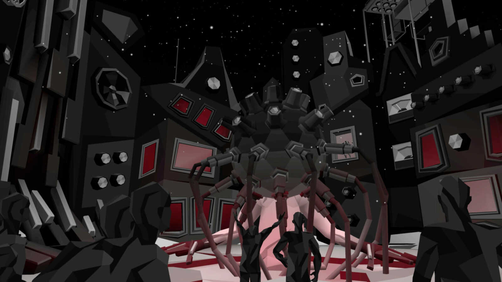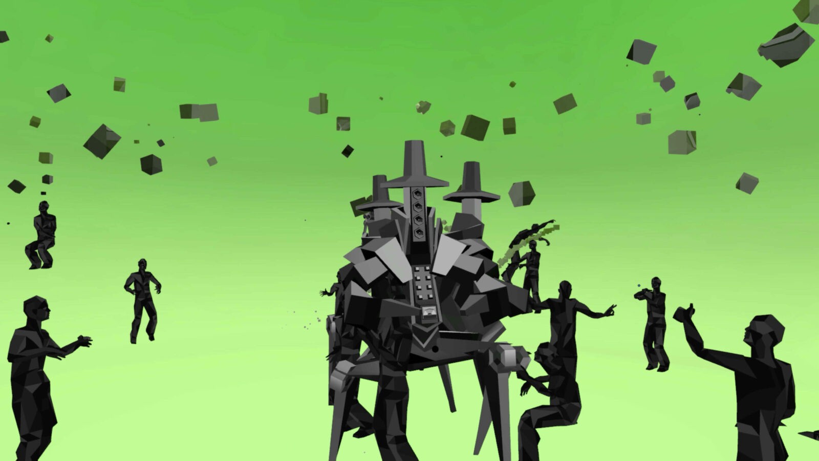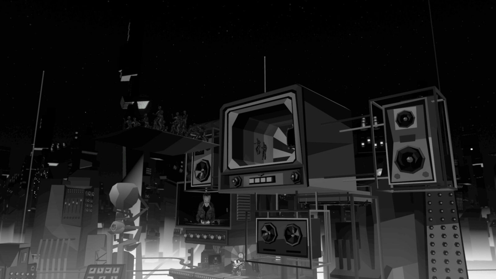 Посетителей встречал холл, провоцирующий тесное скопление аватаров в ожидании начала. Атмосферу поддерживал дресс-код: гостей просили сменить красочные аватары VRChat на стандартные для всех минималистичные образы, которые будто превращали людей в жителей города — действующих лиц перфоманса. Выход из холла в город удивлял неожиданными масштабами происходящего.
