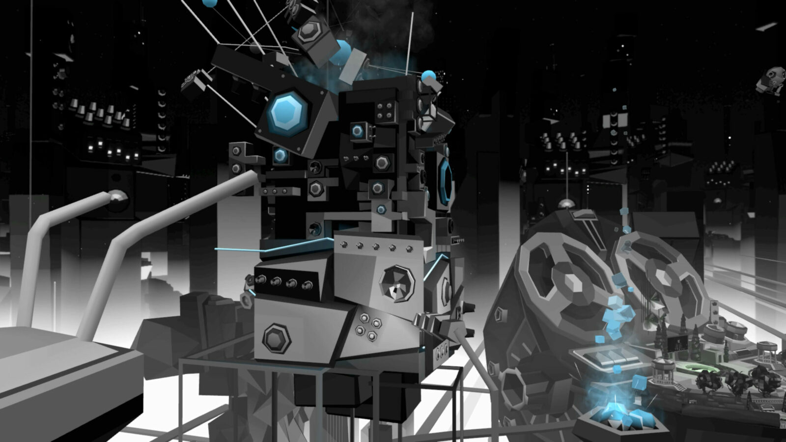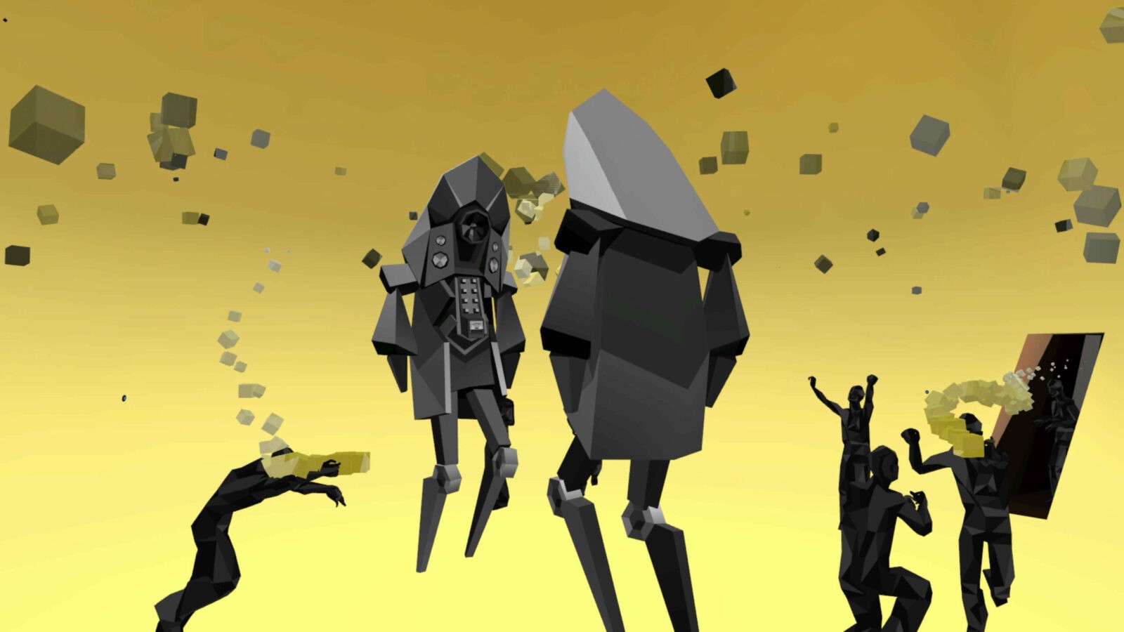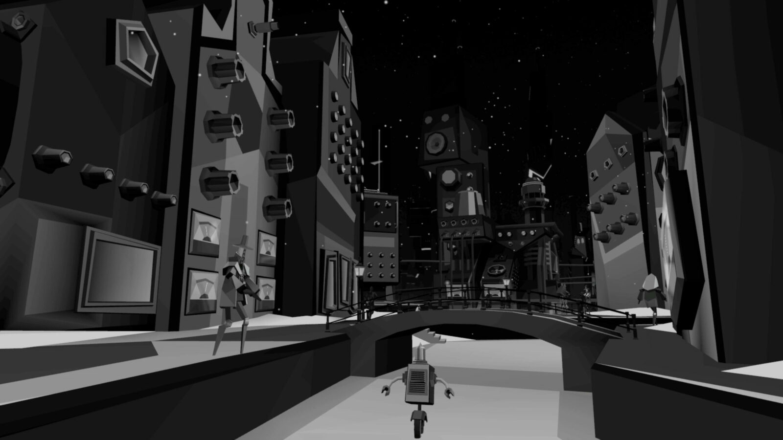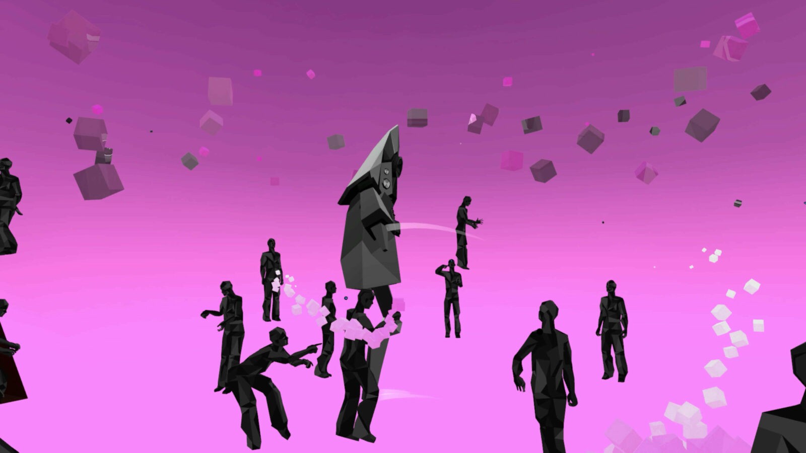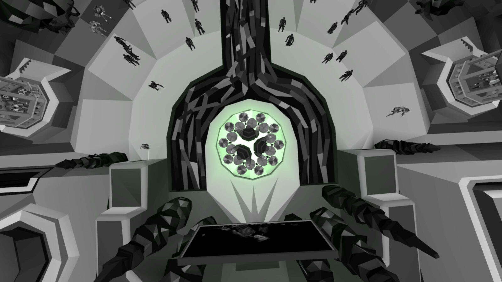 Посетителей встречал холл, провоцирующий тесное скопление аватаров в ожидании начала. Атмосферу поддерживал дресс-код: гостей просили сменить красочные аватары VRChat на стандартные для всех минималистичные образы, которые будто превращали людей в жителей города — действующих лиц перфоманса. Выход из холла в город удивлял неожиданными масштабами происходящего.