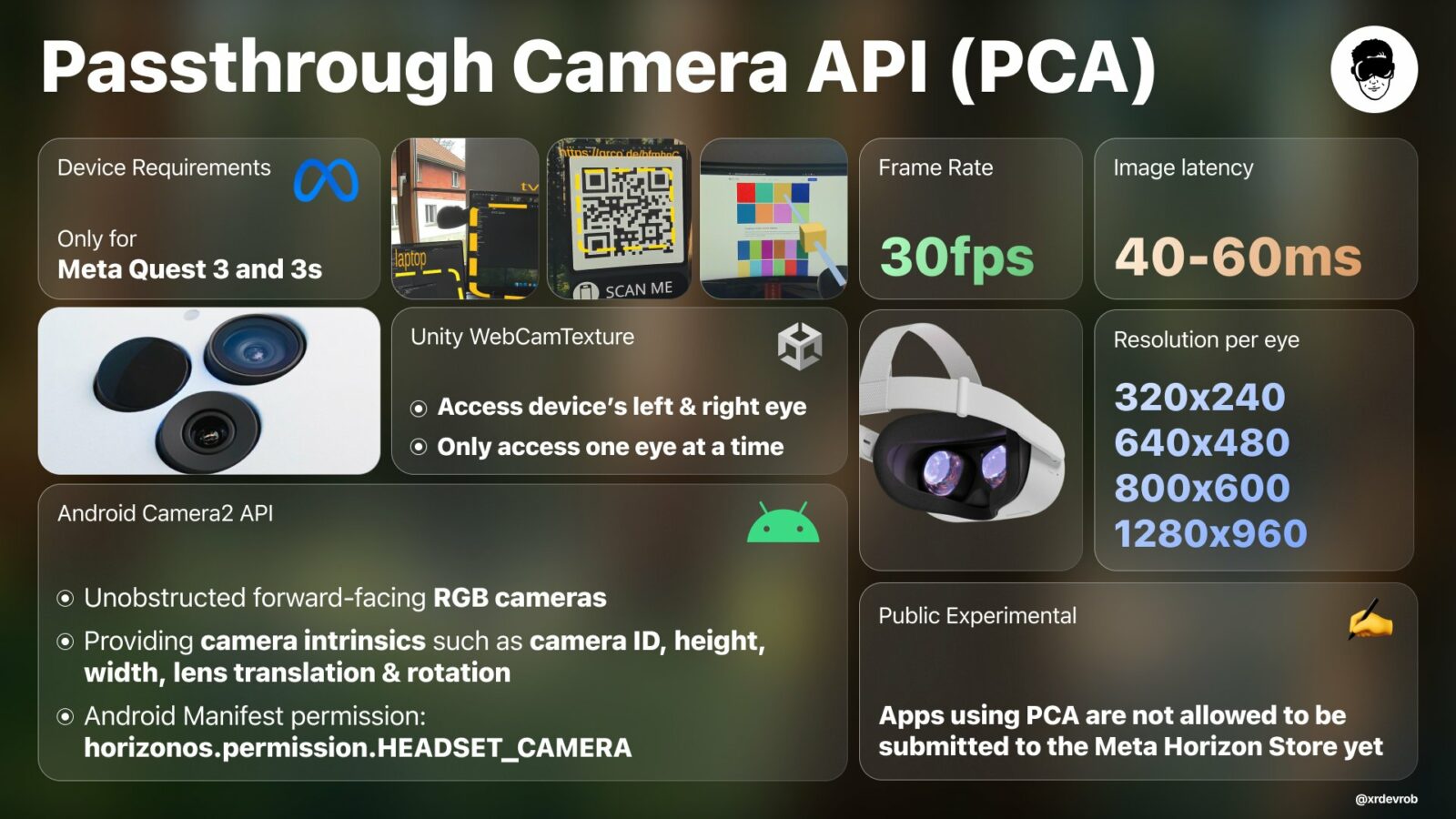 API Passthrough Camera перешёл в публичный доступ, но остаётся экспериментальным. Это означает, что с его помощью разработчики могут создавать приложения и отдельные функции, но пока не могут публиковать это в Horizon Store или включать в опубликованный софт. Для новых API это стандартная практика.