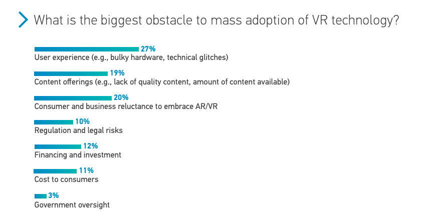 Респонденты считают, что негативный пользовательский опыт из-за таких факторов как громоздкие устройства или технические сбои, является самым большим препятствием для массового внедрения дополненной реальности (26% респондентов) и виртуальной реальности (27% респондентов), но это меньше, чем в 2018 году, когда эти показатели составили 39% для ДР и 41% для ВР. В 2019 году второе место по вреду для массового принятия сохранил выбор контента (24% для ДР и 19% для ВР). В 2018 году результаты были аналогичными: 25% для ДР и 17% для ВР.