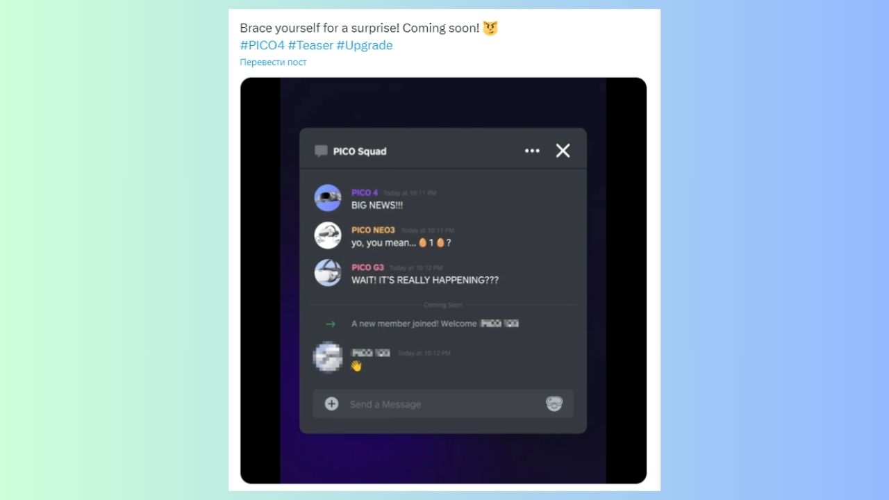 Видео обыгрывает переписку нескольких моделей очков Pico — Pico 4, Pico Neo3 и Pico G3. Pico 4 сообщает, что есть важные новости. В чат заходит новый пользователь под скрытым ником и приветствует остальных. Простой сюжет намекает на появление в линейке ещё одной модели. Владелец аккаунта добавляет: «Приготовьтесь к сюрпризу! Скоро!» А следом идут теги #PICO4, #Teaser и #Upgrade.