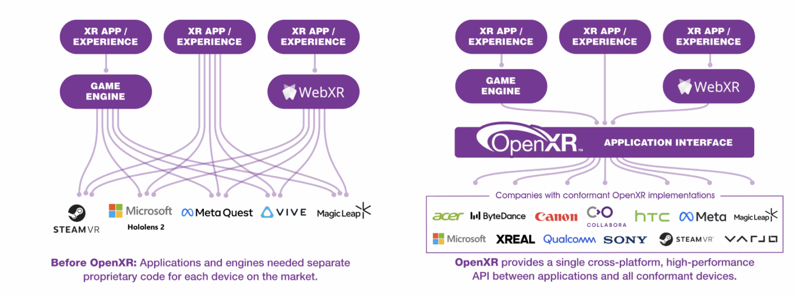 Появление SDK OpenXR разделило стороны конфликта: движок не может диктовать производителям реализации, а производители не могут диктовать, как вызывать движок. Разработка SDK больше не контролируется одним производителем и требует длительных обсуждений между различными сторонами. То, что вендоры раньше решали самостоятельно, теперь решается сотрудничеством трёх сторон: пользователей OpenXR, разработчиков стандарта и разработчиков приложений. Благие намерения OpenXR нивелировались его сыростью.