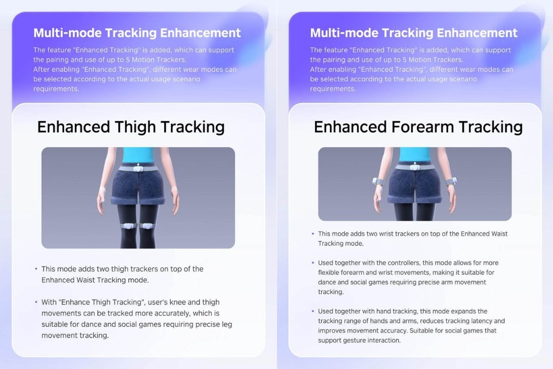 Теперь Pico добавила одновременное подключение до пяти трекеров. Для этого придётся купить две пары стандартных Motion Tracker и один комплект Motion Tracker Waist Version. Вы сможете выбрать одну из двух конфигураций: Enhanced Thigh Tracking (Расширенное отслеживание бёдер) или Enhanced Forearm Tracking (Расширенное отслеживание предплечий). О намерении поддержки семи трекеров для сочетания этих режимов ничего не известно.