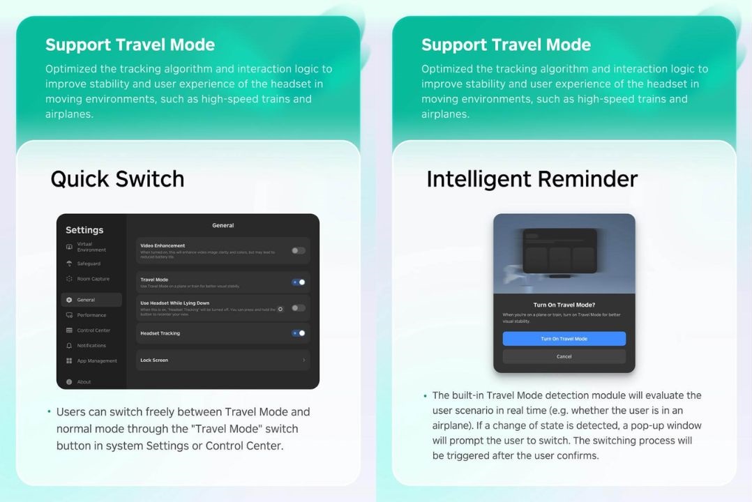 Pico говорит, что очки автоматически предложат включить режим путешествий при обнаружении движения в транспорте, как это делают Vision Pro и Quest. Но активировать его можно и вручную в быстрых настройках.