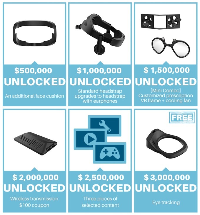 Pimax обещала, что после $3 миллионов выпустит бесплатный модуль окулографии. Он добавится к ряду других аксессуаров, которые выйдут на рынок, благодаря достигнутым на Kickstarter целям: дополнительной лицевой прокладке, ободку с наушниками, линзам, охладителю, беспроводному передатчику и трём приложениям. Все они будут бесплатны для заказчиков, кроме модуля беспроводной передачи данных, к которому полагается скидка в $100.