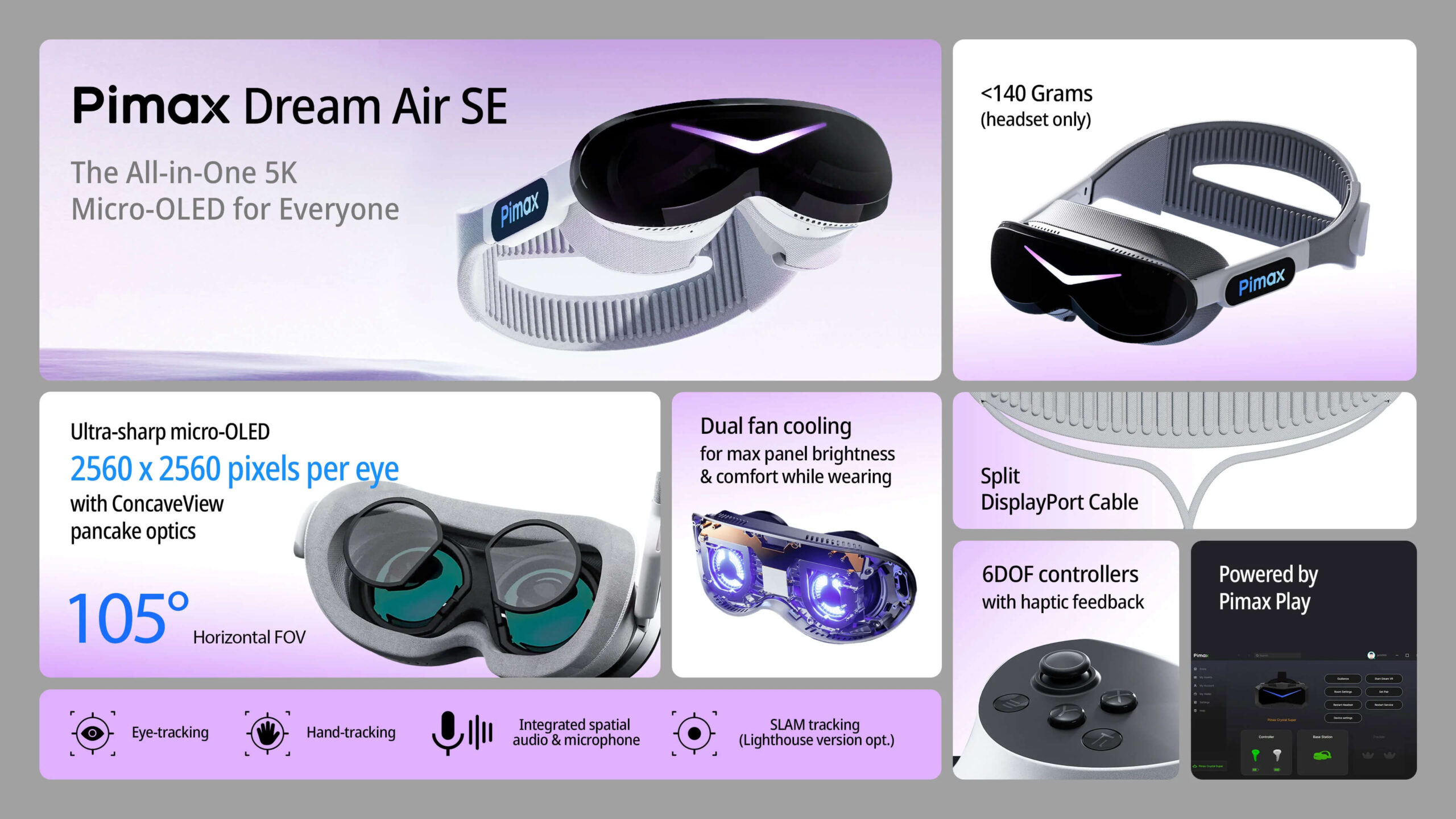 Dream Air SE будут сочетать разрешение 2560×2560 на каждый глаз и панели microOLED при обычном для потребительской техники горизонтальном поле зрения 105°. У устройства будет встроенная позиционная навигация, отслеживание глаз, рук, динамики. Будет версия с поддержкой системы трекинга Lighthouse. Вместе с весом всего в 140 граммов (без оголовья) и ценой $900 (₽76 000) это делает новинку уникальным предложением на рынке очков для ПК — и без досадных особенностей, вроде индивидуальных масок, как у Bigscreen Beyond 2.