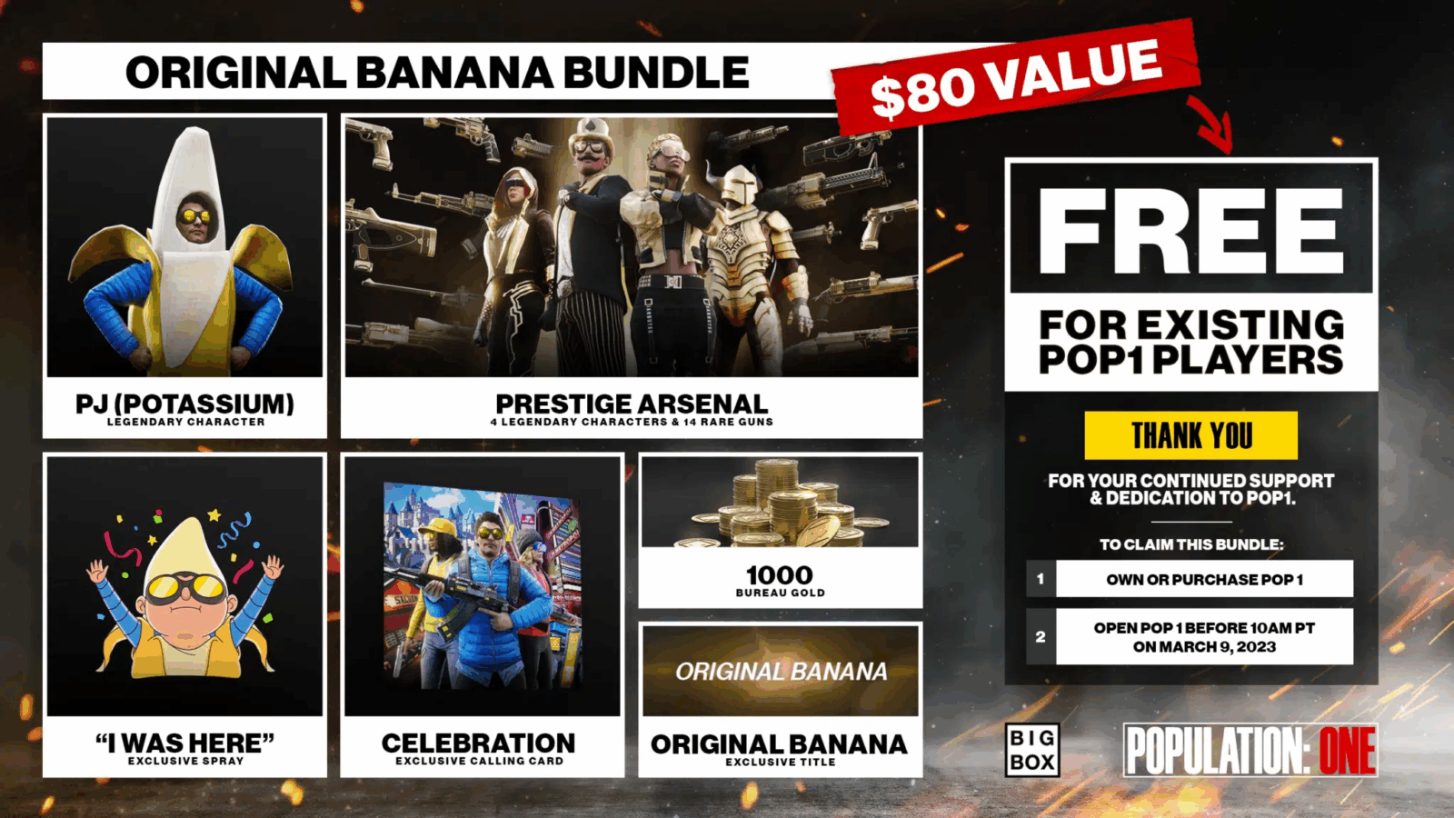 Спустя два с лишним года после выпуска с ценой $30 игра Population: One начала бесплатно пускать владельцев Quest. Люди, уже совершившие покупку, получат в качестве компенсации «Оригинальный банановый набор» (Original Banana Bundle), в который входит специальный персонаж PJ (Potassium), четыре легендарных персонажа, 14 редких единиц оружия, эксклюзивное граффити, 1000 золотых и многое другое.