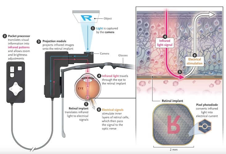 Устройство работает в паре с очками дополненной реальности с миниатюрной видеокамерой. Камера снимает окружающую обстановку и отправляет данные на набедренный компьютер. Там алгоритмы искусственного интеллекта обрабатывают изображения в реальном времени, фильтруя и упрощая их, прежде чем спроецировать обратно в глаз в виде инфракрасного сигнала. Имплант обнаруживает этот сигнал, преобразует его в электрические импульсы и передаёт в зрительный нерв.