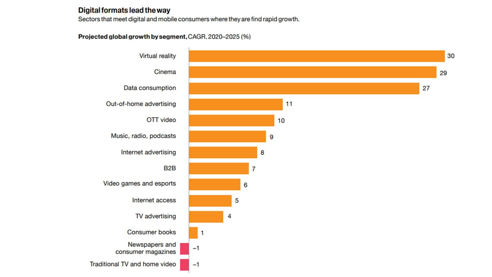 Глобальный доход от контента виртуальной реальности за прошлый год аналитики оценивают примерно в $1,8 миллиарда. Это на 31,7% больше, чем оценка по 2019 году, что делает данный медиасегмент самым быстрорастущим среди основных видов развлечений и СМИ. Худшие результаты показали печатные средства массовой информации и эфирное телевидение.