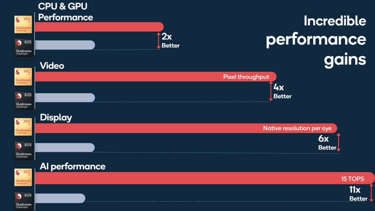 Основой дизайна является чип Snapdragon XR2. Qualcomm обещает разрешение до 3×3K на глаз при частоте 90 Гц, интегрированную систему связи 5G, поддержку семи каналов для камер и значительно большую вычислительную мощность по сравнению со Snapdragon 835, одним из самых распространённых наборов микросхем в современных автономных очках, включая Quest.