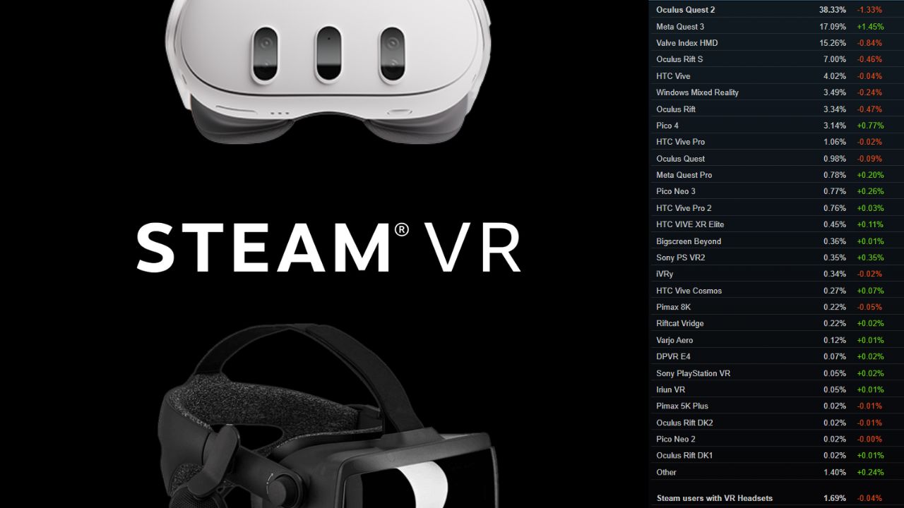 Сильные позиции Meta на рынке в целом и в статистике Steam в частности могут значить, что без серьёзных рыночных потрясений Quest 2 (38,33%) уступят место именно Quest 3 (–17,09%), а не устройствам конкурентов. Динамика это подтверждает: у Quest 2 самое большое падение за месяц (–1,33%), а у Quest 3 самый большой рост (–1,45%). Всё остальное отстаёт на порядок по всем параметрам. У Valve Index доля составила 15,26% при снижении популярности на 0,84%.