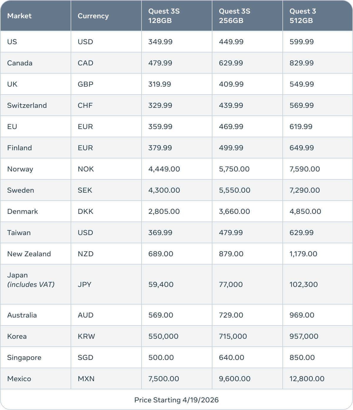С конца этой недели Quest 3 и Quest 3S официально подорожают. Речь идёт о постоянном повышении отпускной цены, которое представители Meta* объясняют «значительным ростом» стоимости производства.