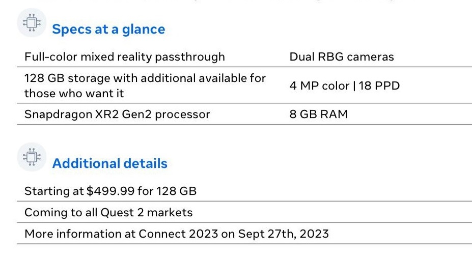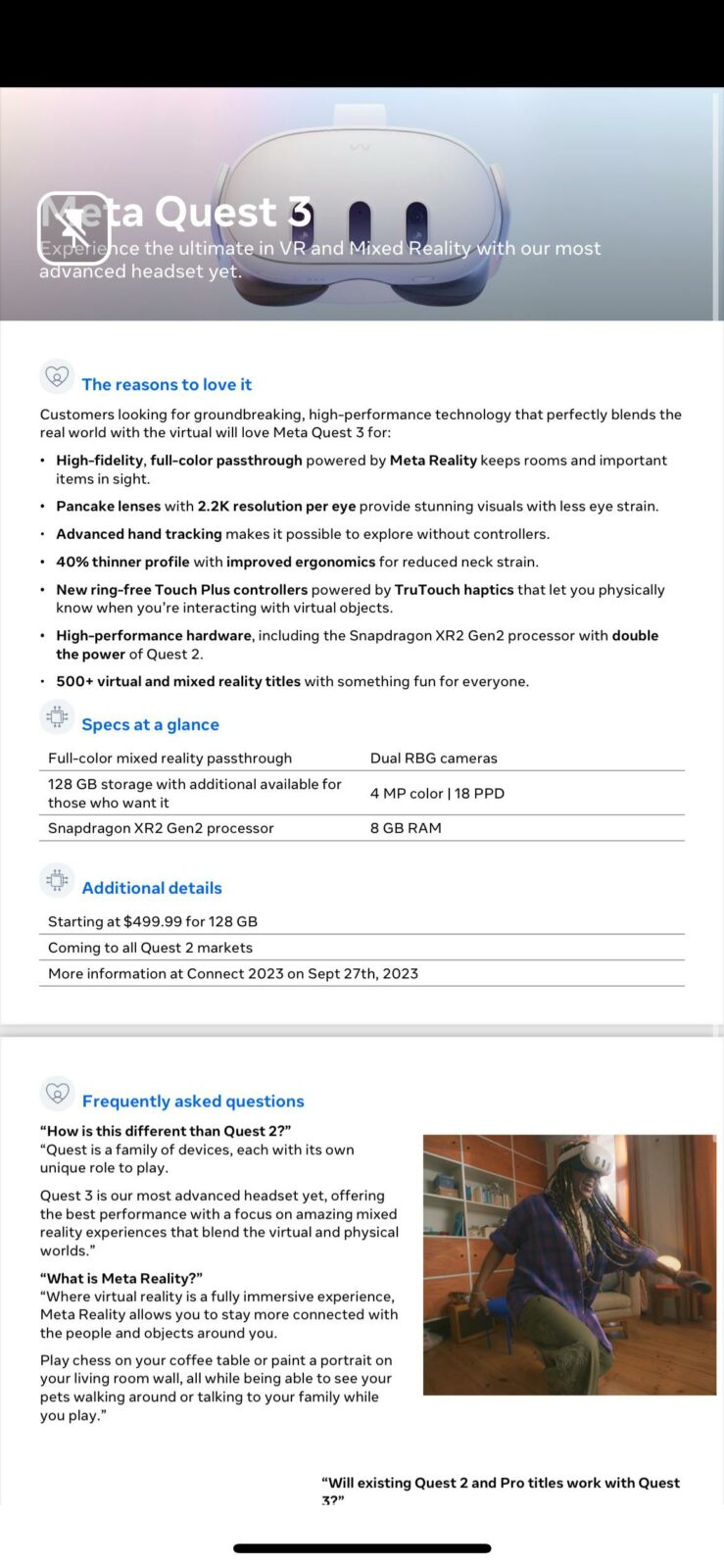 Пользователь Reddit под ником JMS1717 опубликовал, как он утверждает, официальный список характеристик Quest 3. Документ похож на инструкцию для продавцов. Большая часть его содержимого известна, за исключением того, что у очков всего 8 гигабайт оперативной памяти и угловое разрешение 18 пикселей на градус.