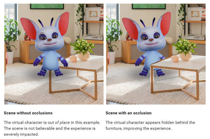 Помимо окклюзии, они также могут использовать Depth API для визуальных эффектов на основе глубины в смешанной реальности, таких как туман.