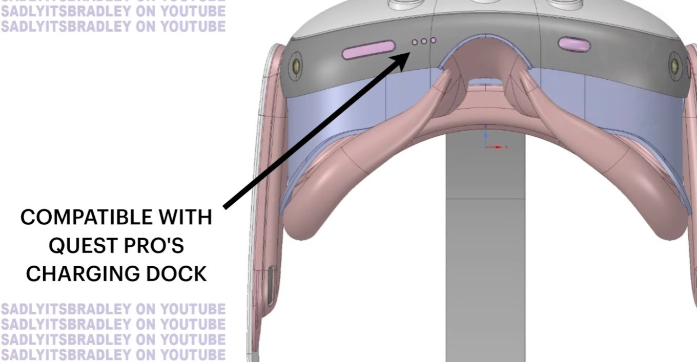 На противоположной от колеса стороне нижней части корпуса по чертежам располагаются контакты док-станции. Возможно, Quest 3 будут совместимы с доком от Quest Pro. Рядом с контактами — качель регулировки громкости. Два динамика на дужках почти не изменили местоположения.