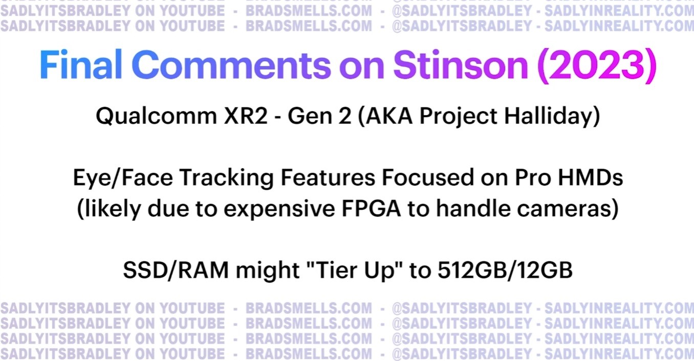 Блогер Брэдли Линч (Bradley Lynch) представил информацию о Quest 3. В его руки попали чертежи и инсайдерские данные, согласно которым новинка выйдет в 2023 году и, как второе поколение, останется на ступень ниже Quest Pro, поскольку не получит некоторых систем, вроде трекинга глаз. Зато будут обновления многих компонентов.