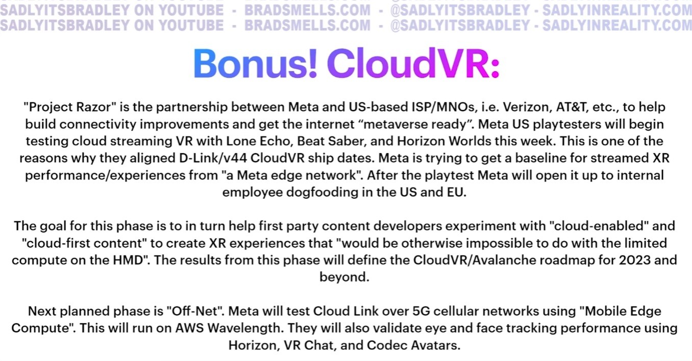 Наконец, слухи говорят о тестировании объединённым коллективом Meta и американских операторов связи проекта «Бритва» (Project Razor) по полной или частичной трансляции приложений виртуальной и дополненной реальности с облачных серверов. Тесты якобы проводят на играх, таких как Lone Echo и Beat Saber, и социальных приложениях, вроде Horizon Worlds.