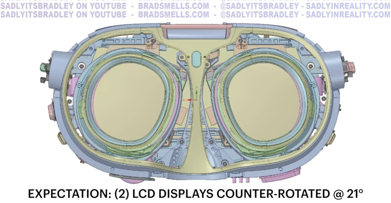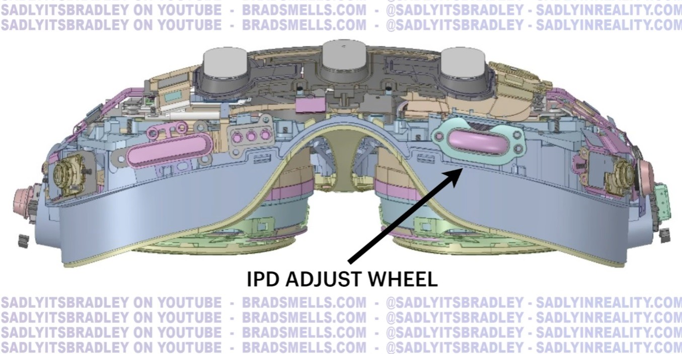 Дисплеи с жидкокристаллическими матрицами повёрнуты друг против друга на 21 градус, что похоже на конструкцию Quest Pro. Оптические модули настраиваются по межзрачковому расстоянию колесом на нижней части корпуса, что намного точнее и удобнее сдвигания и раздвигания линз руками, как в Quest 2. Здесь мы возвращаемся к корням. Само наличие колеса является следствием отсутствия трекинга глаз, с которым очки могут автоматически замерять межзрачковое расстояние и двигать линзы электромотором.