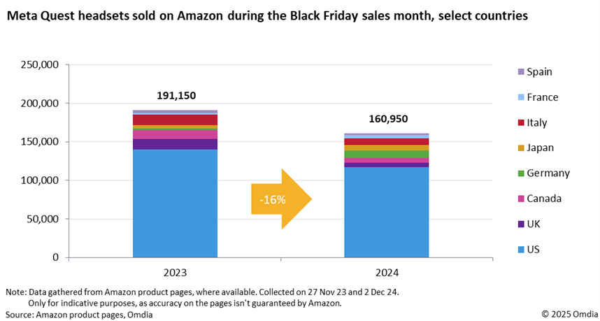 Второй показатель — данные из продуктовых карточек Amazon. В ноябре 2024 года, во время распродаж Чёрной пятницы, здесь нашли покупателей более 160 000 Quest в восьми странах, что на 16% меньше продаж 2023 года. Quest 3S заняли 66% продаж, а Quest 3 — практически всё остальное.