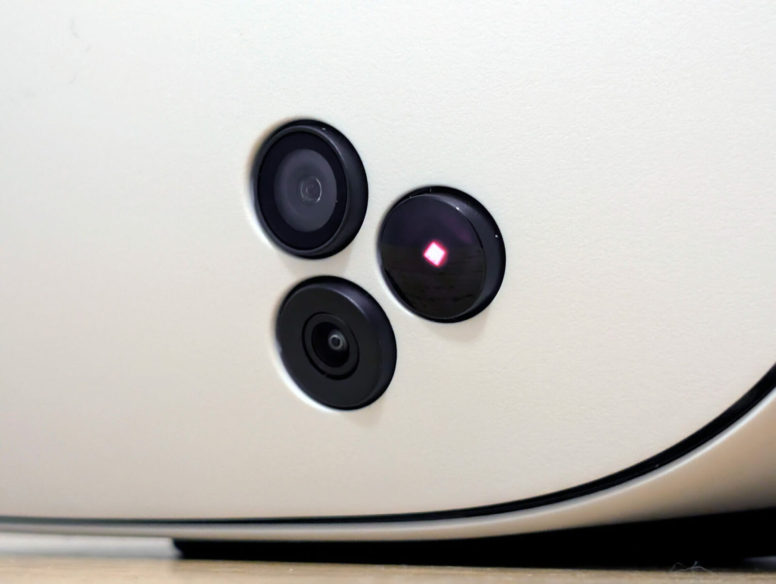 Причина в том, что в Quest 3S есть инфракрасная подсветка на передней панели. Два кластера датчиков состоят из камеры сквозной трансляции (сверху), камеры слежения (снизу) и ИК-подсветки (посередине). Последняя помогает камерам трекинга получать чёткое изображение рук и других близлежащих объектов.