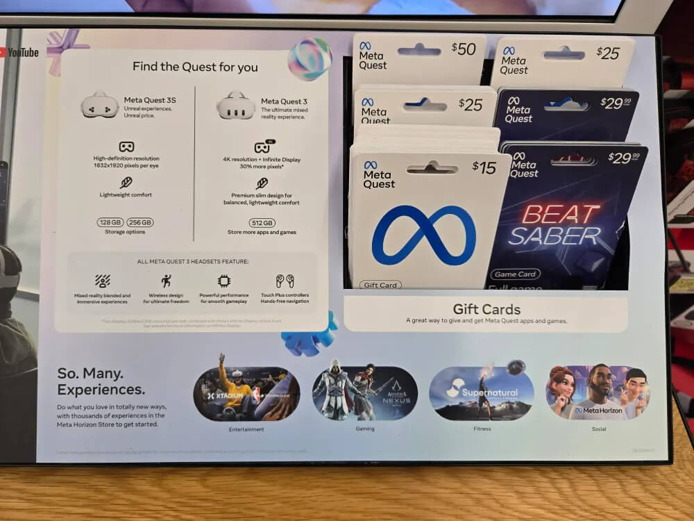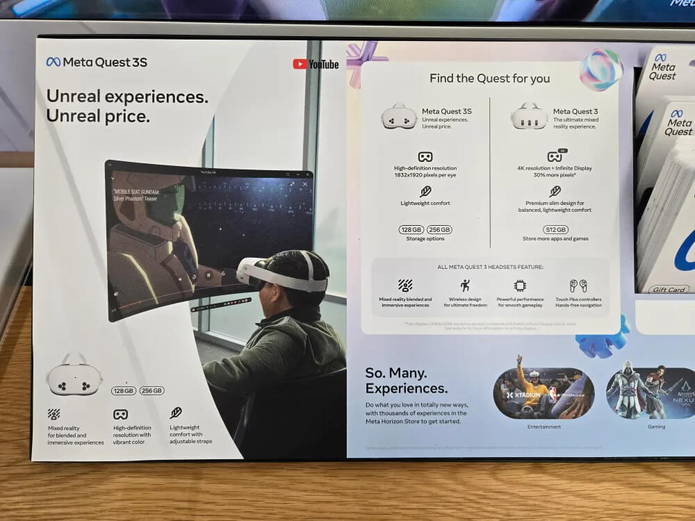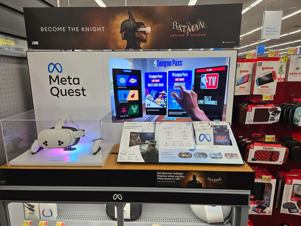 Walmart подготовил стенды для презентации Quest 3S покупателям офлайновых магазинов. Фотографии прилавков доказывают, что новинку будут продавать с контроллерами и игрой Batman: Arkham Shadow в комплекте, а также то, что продажи начнутся вскоре после показа новинки на конференции Connect 2024 25 сентября.