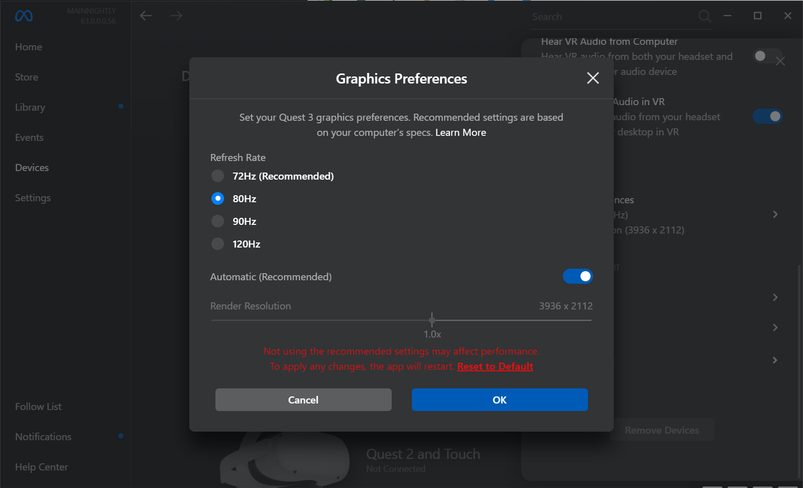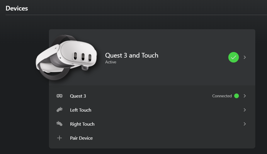 Проводная связь Link теперь поддерживает частоту обновления 120 Гц при стриминге на Quest 3. Чтобы включить эту функцию, перейдите в раздел «Устройства» (Devices) приложения Quest Link, найдите свои очки и нажмите символ «>» рядом с названием. Внизу найдите раздел настроек графики и активируйте нужную частоту.