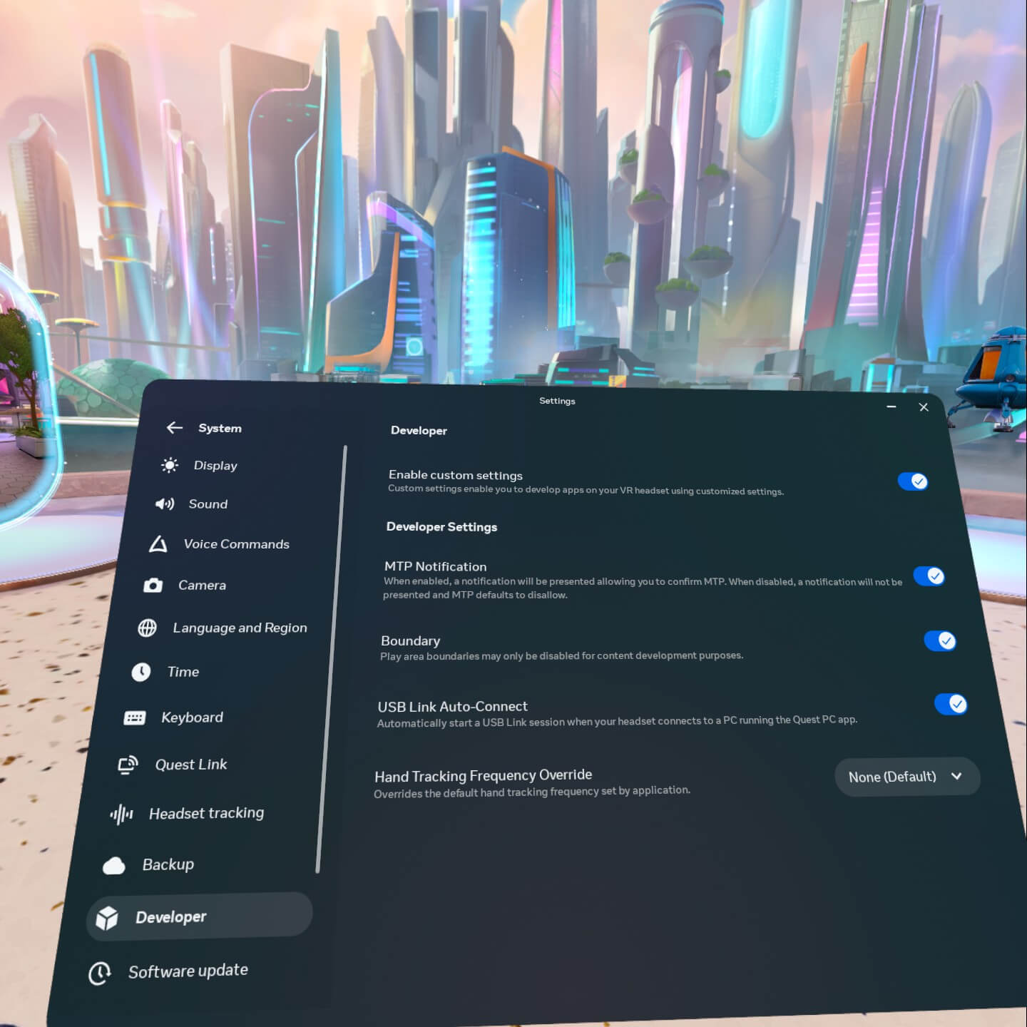 Чтобы упростить труд разработчиков приложений для Quest, компания начала собрала специальные настройки Link в разделе «Настройки Quest» > «Настройки» > «Разработчик» (Quest Settings > Settings > Developer).
