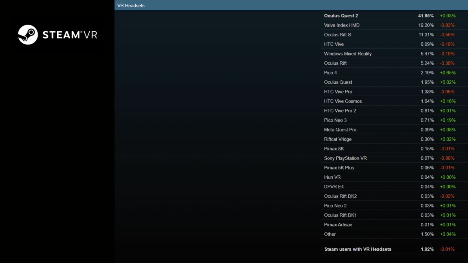 Общий процент пользователей Steam с ВР-очками составляет 1,92% и снижается. Статистика Valve непрозрачна и учитывает не все устройства, а лишь те, по которым пользователи разрешили предоставить информацию в течение отчётного месяца. Несмотря на популярность Steam, воспринимать её как срез всего рынка ошибочно.