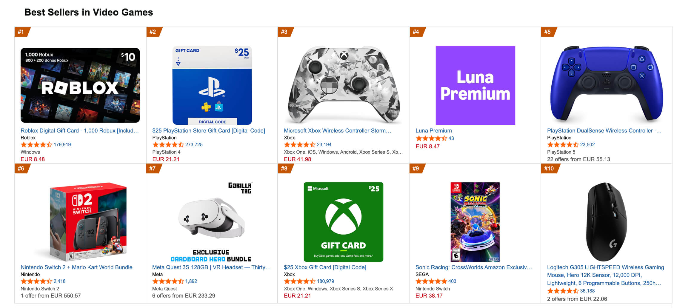 Все прочие игровые консоли продавались хуже, чем Quest и Switch 2. В списке бестселлеров Amazon в категории «Видеоигры» Quest 3S на 128 ГБ борются с комплектом Nintendo за шестое и седьмое места. PlayStation 5 были на 13-м месте, Quest 3 (512 ГБ) — на 24-м, а Xbox Series X — на 60-й позиции списка «бестселлеров».