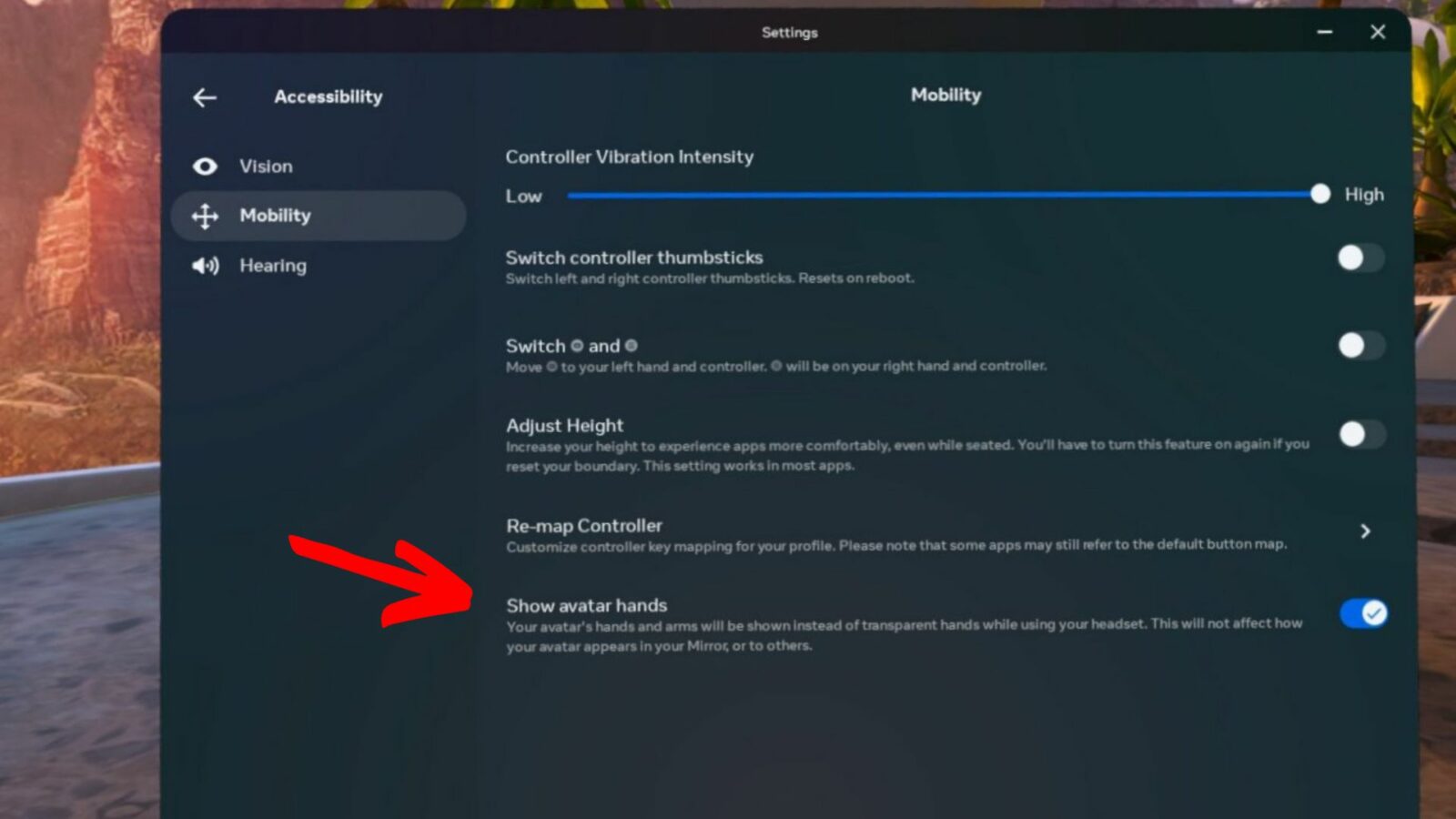 Описание гласит: «При использовании очков вместо прозрачных рук будут отображаться руки и ладони вашего аватара. Это не повлияет на то, как ваш аватар будет выглядеть в вашем зеркале или для других». Опция находится по адресу Settings > Accessibility > Mobility > Show avatar hands, то есть в подразделе перемещений настроек доступности.