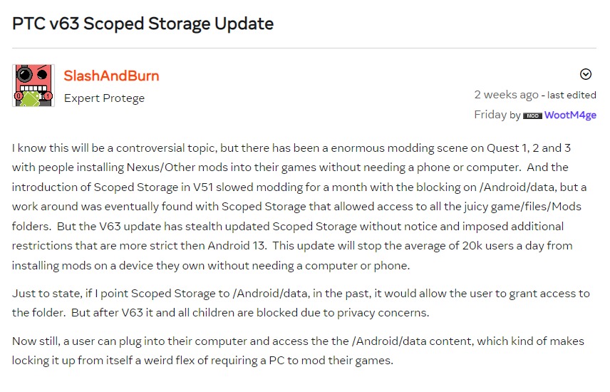 В продолжение темы обновления v63, оно, похоже, закрыло полезную возможность. Из него пропала работа с ограниченным хранилищем Scoped storage, системной областью с ограниченным доступом к данным пользователей и приложений. Она позволяет приложениям взаимодействовать с папками для таких задач, как создание игровых модификаций.