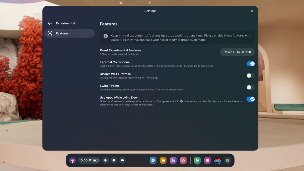Одной из главных особенностей обновления v63 стало добавление в Quest 2 и Pro экспериментального лежачего режима для работы с приложениями. При его активации повторное центрирование (удерживание кнопки Oculus / Meta на правом контроллере или удерживание указательного пальца правой руки на большом пальце) при взгляде вверх поворачивает виртуальную систему координат на 90 градусов вверх. Это увеличивает комфорт взаимодействия с приложениями, когда пользователь лежит.