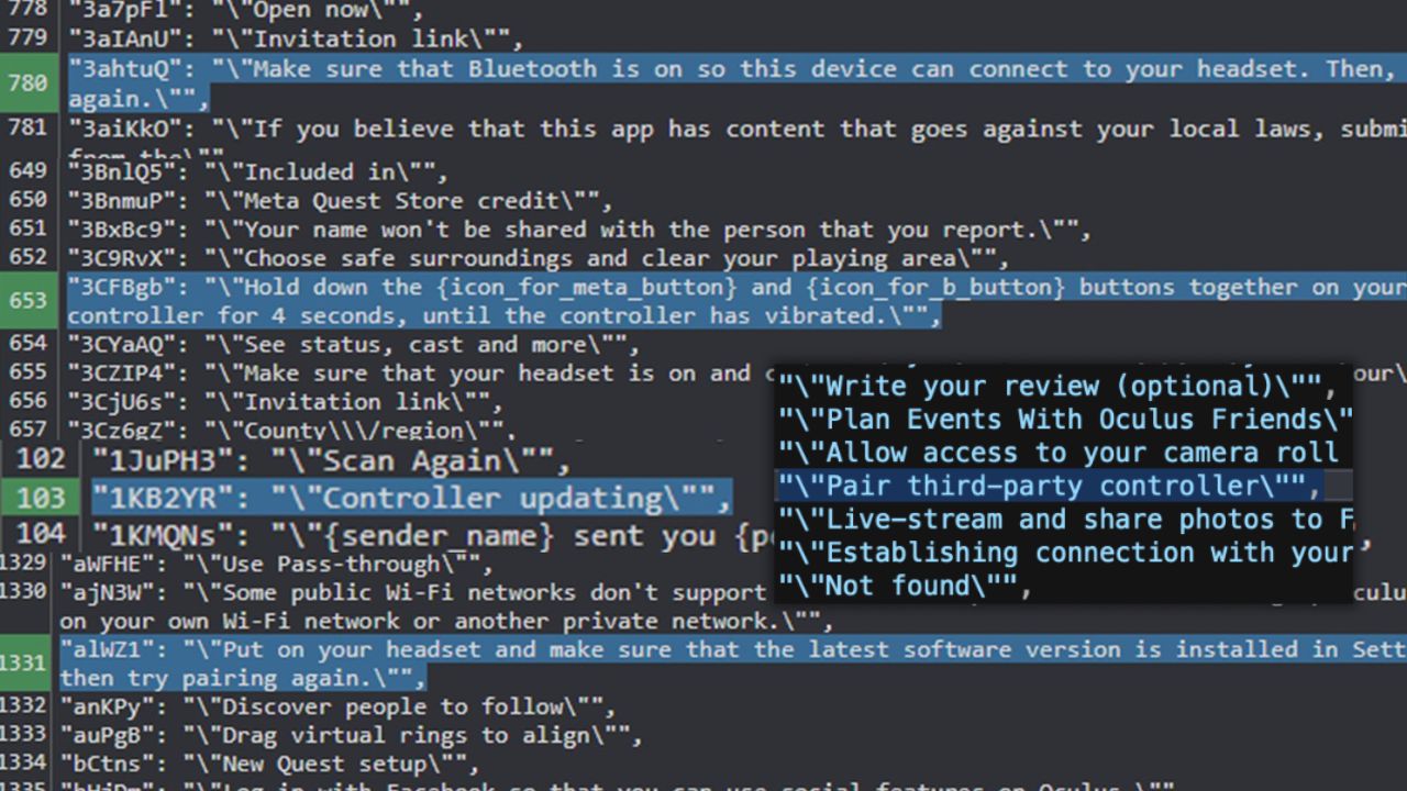 Ещё одна находка оказалась в коде приложений Quest для iOS и Android. Строки расплывчато упоминают подключение к очкам сторонних контроллеров, что в настоящее время невозможно. Предположительно, этот код может означать сопряжение с контроллерами других производителей, геймпадами или продажу следующей модели Quest без контроллеров ради понижения отпускной цены.