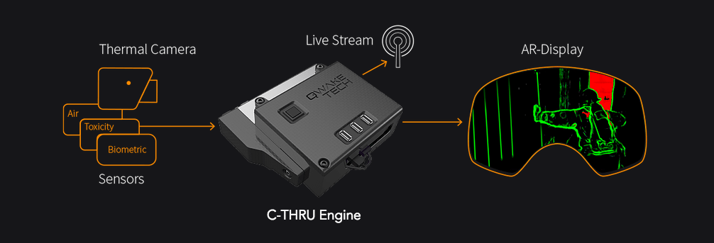 Электронно-оптическая система дополненной реальности от Qwake Tech называется «C-THRU». За вычисления в ней отвечает небольшой выносной блок на процессоре Nvidia Tegra. Передача визуальных данных производится через прозрачный волноводный дисплей перед глазами пользователя. Главным достоинством системы является скорость, с которой пользователь реагирует на новую информацию: для этого ему больше не нужно останавливаться, занимать руки портативным устройством и отвлекаться на его экран. Похожее преимущество дополненная реальность даёт водителям.