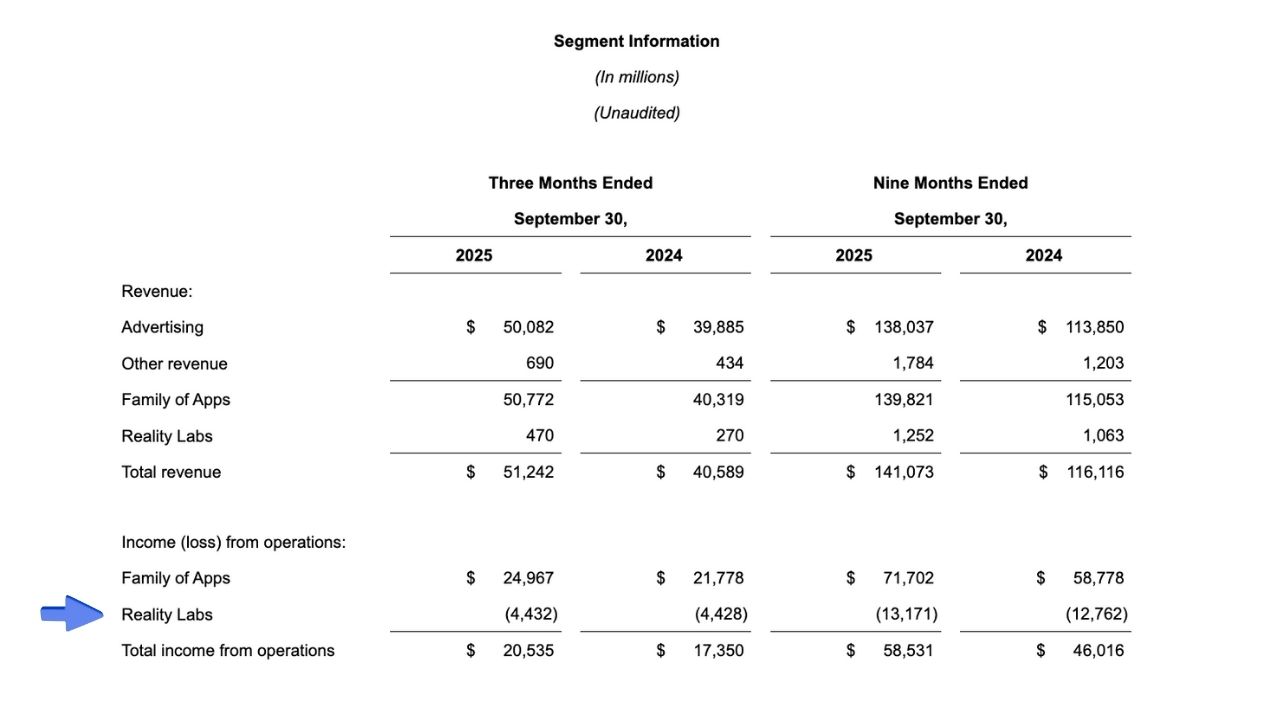 Финансовый директор Сьюзан Ли сообщила аналитикам, что Meta ожидает снижения выручки Reality Labs за четвёртый квартал год к году. Ли пояснила, что это отчасти связано с тем, что компания не представила новых Quest в 2025 году.