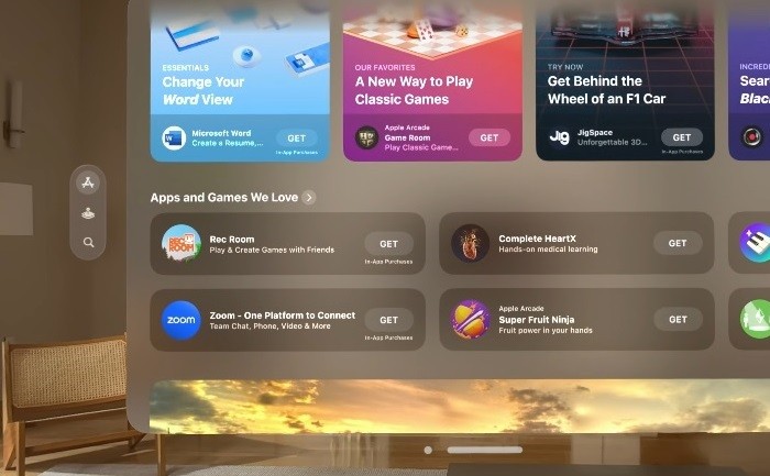 Вместе с Rec Room на скриншоте вы можете видеть обычные, экранные приложения, такие как Word и Zoom. App Store на visionOS поддерживает пространственный софт и некоторые приложения для iPhone и iPad, поэтому во всех случаях непонятно, идёт ли речь о портированной версии для экранов или о версиях для виртуальной или дополненной реальности. Представитель Rec Room не стал отвечать на соответствующий вопрос.