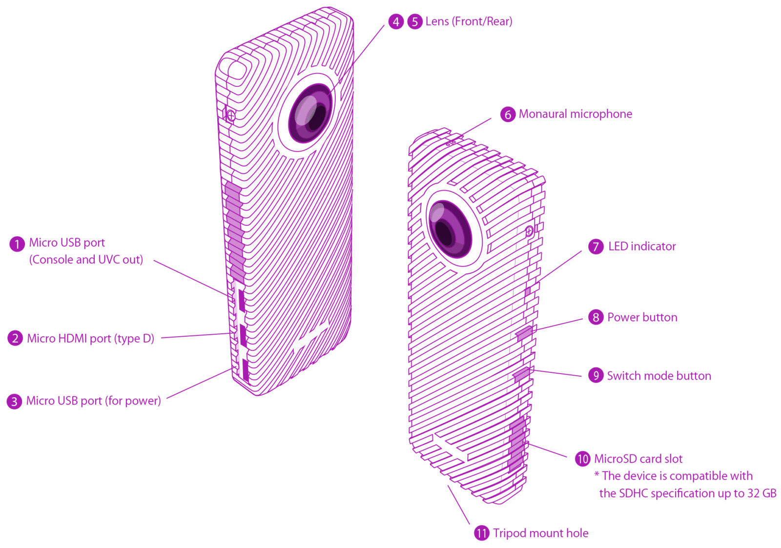 Японский производитель электроники Ricoh представил миниатюрную камеру R Development Kit с двумя широкоугольными объективами, которая создана для ведения круглосуточного потокового вещания в формате 360 градусов. Устройство может передавать видео с разрешением FullHD на скорости 30 кадров в секунду, поддерживает карты microSD и на ходу сшивает видео через специальное программное обеспечение Ricoh R Console для Windows и OS X. Поддерживается подключение по HDMI или USB.