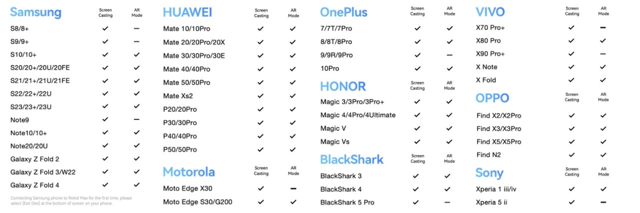 В списке совместимых смартфонов десятки моделей от Samsung, Huawei, Oppo, Sony, Motorola, Vivo, OnePlus, Honor и BlackShark. Устройства Apple с портами Lightning или USB-C, не входящие в список прямой совместимости, работают только через беспроводной адаптер.