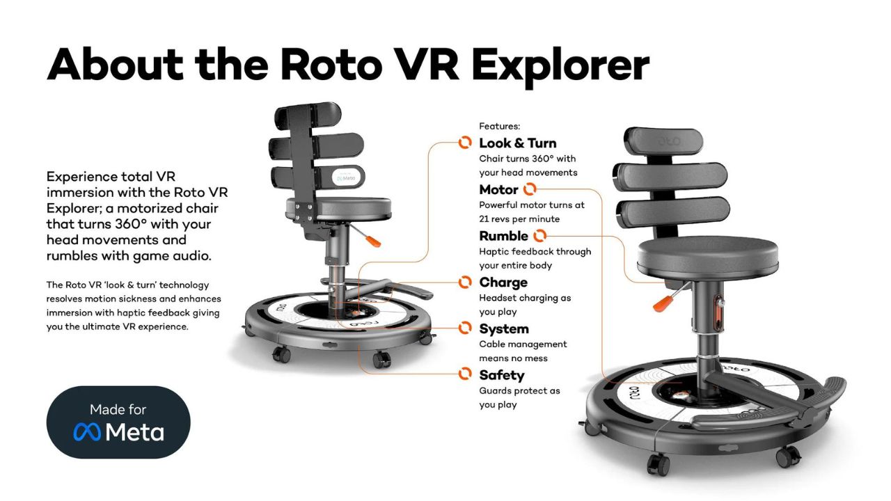 Roto VR Explorer похоже на офисное кресло. Здесь мягкое сиденье с покрытием из искусственной кожи, спинка и колёса для свободного перемещения по полу. Его можно регулировать по высоте, тут есть подставка для ног. Изюминкой устройства стал привод, который поворачивает сидящего вокруг своей оси, когда он совершает соответствующее движение в виртуальной реальности. По задумке разработчиков, новинка поможет справиться с проблемой укачивания, возникающей из-за рассинхронизации сигналов глаз и ощущений внутреннего уха.
