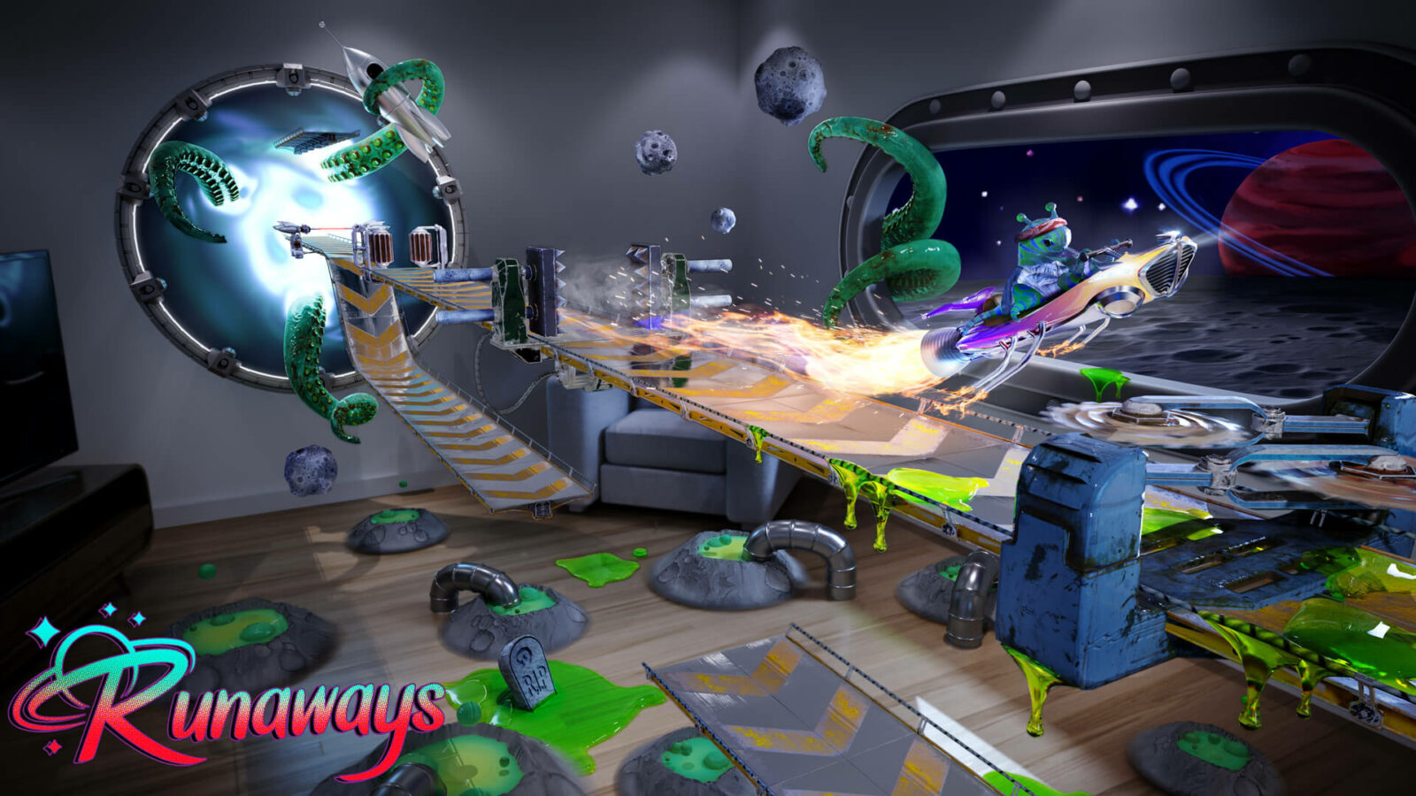 Студия Beyond Games готовит к выпуску Runaways, бесконечный приключенческий раннер, разработанный специально для Apple Vision Pro. В нём вы Хэнк, мятежник, который вырывается из грязных шахт на свободу, прочь от монстров этой планеты. Здесь придётся мгновенно принимать решения на динамически генерируемых и полных ловушек скоростных трассах, которые развернутся прямо в домах геймеров в смешанной реальности.